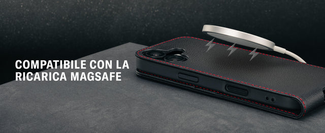 La custodia a libro in pelle per iPhone 17 è stata progettata per essere compatibile con i caricabatterie MagSafe ufficiali. La ricarica MagSafe richiede un alimentatore con un'uscita minima di 20 W (27 W sono raccomandati per il caricabatterie MagSafe Duo). Non possiamo garantire la compatibilità con altri accessori MagSafe. La custodia non è adatta per l'uso con supporti MagSafe verticali, caricabatterie MagSafe per auto, ecc.